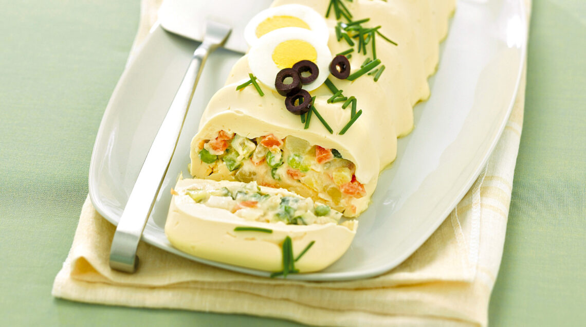 3 Disponete buona parte della maionese gelatinata sul fondo e sulle pareti dello stampo e fate rapprendere in frigo per 5 minuti. Riempite lo stampo con l'insalata russa, coprite con la maionese gelatinata restante e mettete in frigo a rassodare per almeno 3 ore.