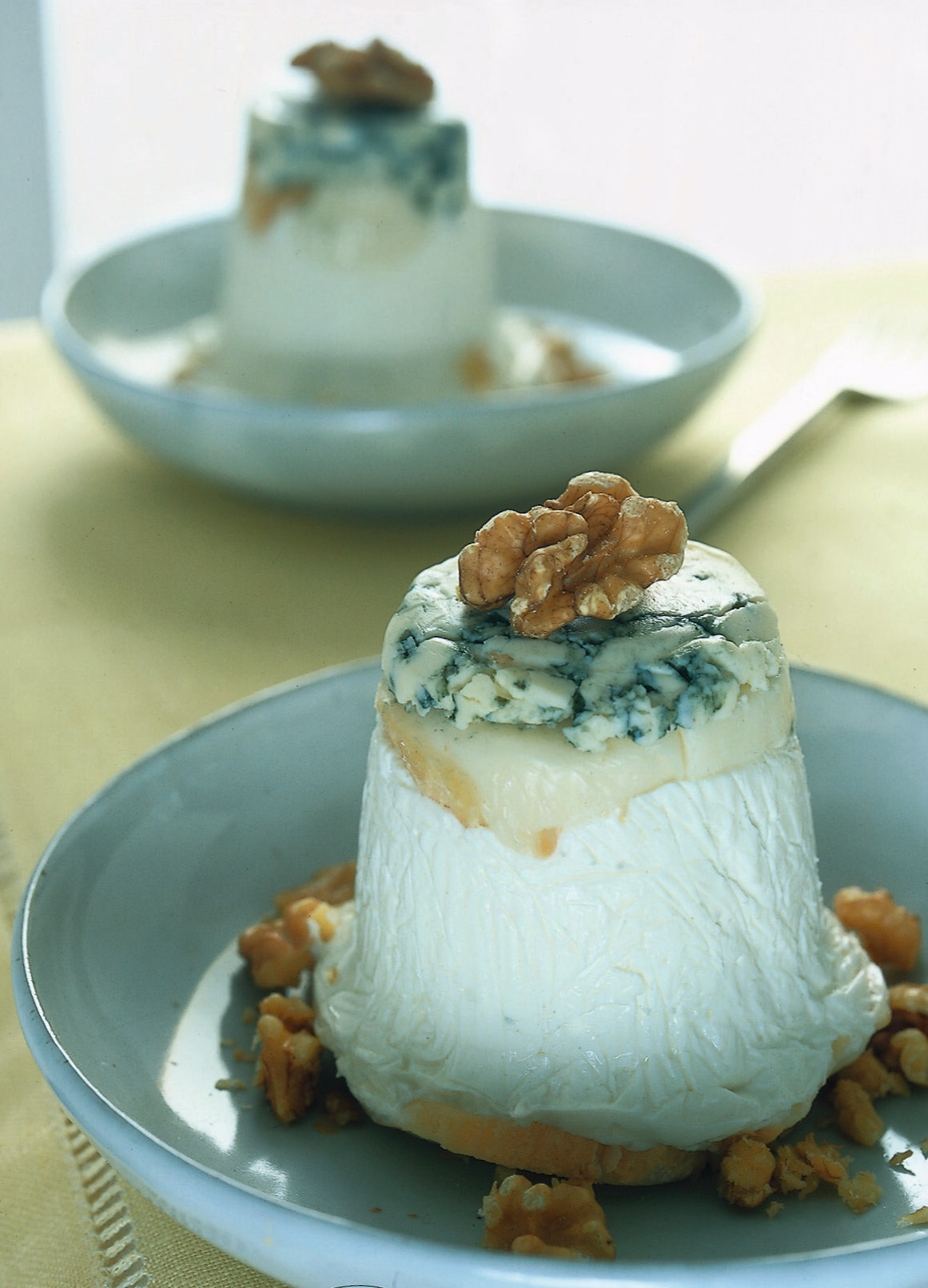 Abbiamo scelto tre nobili formaggi, robiola, taleggio, Roquefort, per questo antipasto creativo e raffinato, aromatizzato con la vodka e servito con gherigli di noce e miele di castagno. Se non amate il sapore pungente della robiola, potete sostituirla con altrettanta ricotta e guarnire le preparazioni con mandorle o nocciole.