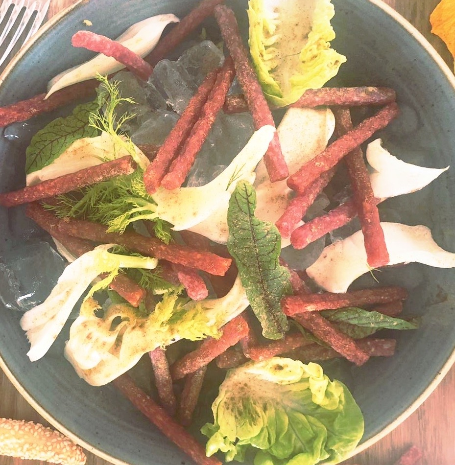Tagliare i finocchi a pezzi grossi, porli in acqua e ghiaccio e servire con la polvere di liquirizia.
