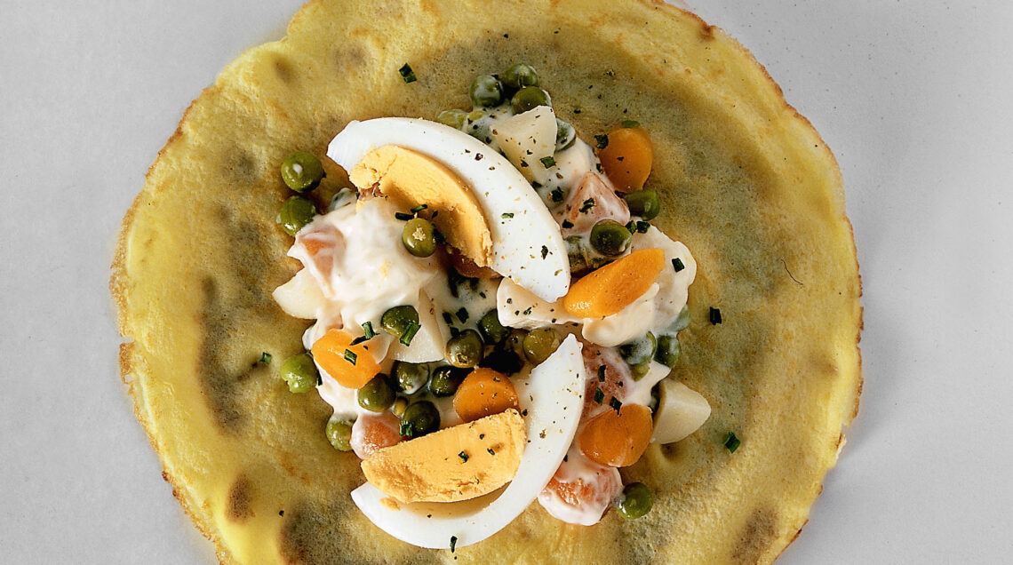 4 Dividete l'insalata russa sulle crespelle, completate con le uova tagliate a spicchi. Cospargete, a piacere, con prezzemolo tritato e servite.