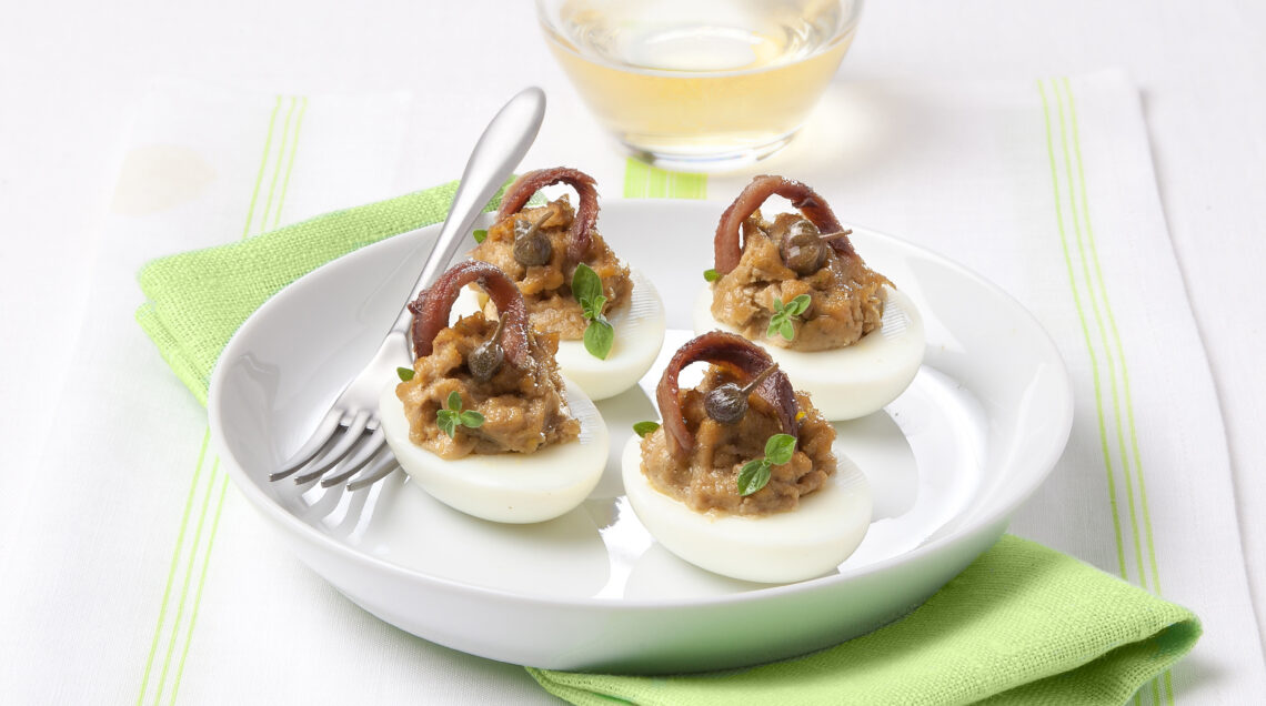 3 Farcite i mezzi albumi con la mousse preparata, insaporiteli e decorateli con filetti d'acciuga sott'olio, capperi e foglioline di erbe aromatiche.