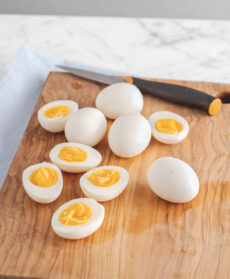 Mettete le uova in una pentola, copritele con acqua fredda e cuocetele per 9 minuti dal momento del bollore. Raffreddatele sotto acqua corrente, sgusciatele e tagliatele a metà nel senso della lunghezza.