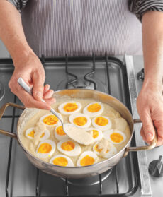 Scaldate la salsa Falstaff con una noce di burro e sistematevi le uova con la parte tagliata verso l'alto. Portate il tutto al limite del bollore irrorando le uova con qualche cucchiaio di salsa. Accompagnate con fette di polenta abbrustolita.