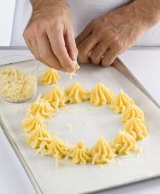 Trasferite la pasta in una ciotola, incorporatevi 3 uova, uno per volta, lavorando con le fruste elettriche su cui avrete montato i ganci per impastare. Aggiungete 100 g di gruyère, grattugiato, un pizzico di noce moscata e pepe. Coprite una placca con un foglio di carta da forno. Disegnate sul foglio un cerchio da 22-24 cm e girate il foglio con la traccia disegnata verso la placca.