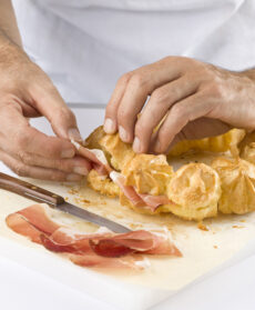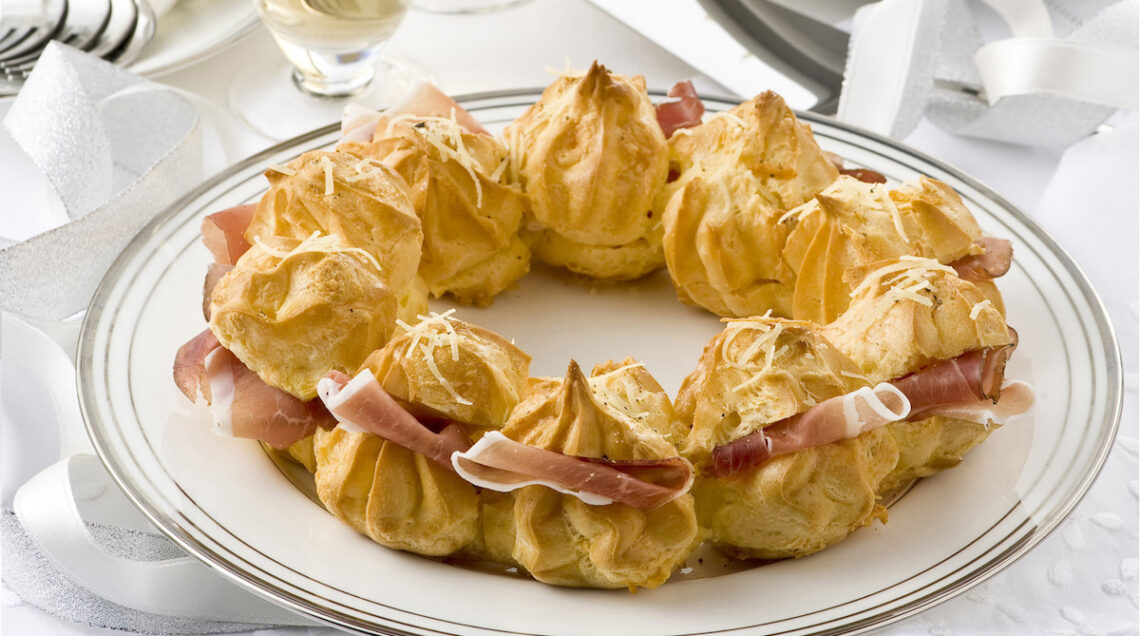 Un antipasto sfizioso, elegante, scenografico: l'impasto fatto in casa è insaporito con gruyère e farcito con un pregiato salume
