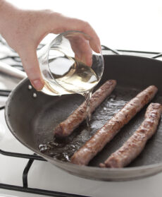 Portate a ebollizione abbondante acqua e cuocete i wurstel per circa 1 minuto; sgocciolateli, lasciateli raffreddare e teneteli da parte. Con un coltello incidete la salsiccia nel senso della lunghezza e togliete il budello. Scaldate un filo d'olio in una padella antiaderente e rosolate la salsiccia uniformemente a fiamma vivace. Sfumate con 1/2 bicchiere di vino, abbassate la fiamma e continuate a cuocere per 4-5 minuti. Sgocciolate la salsiccia e lasciatela raffreddare.