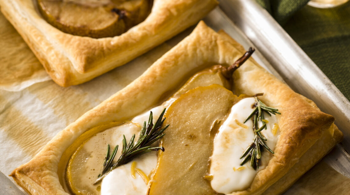 2) Taglia la pasta sfoglia in 4 rettangoli e sovrapponili a 2 a 2, schiacciandoli leggermente con un matterello. Disponici sopra le fette di pera e inforna per una decina di minuti a 190°.