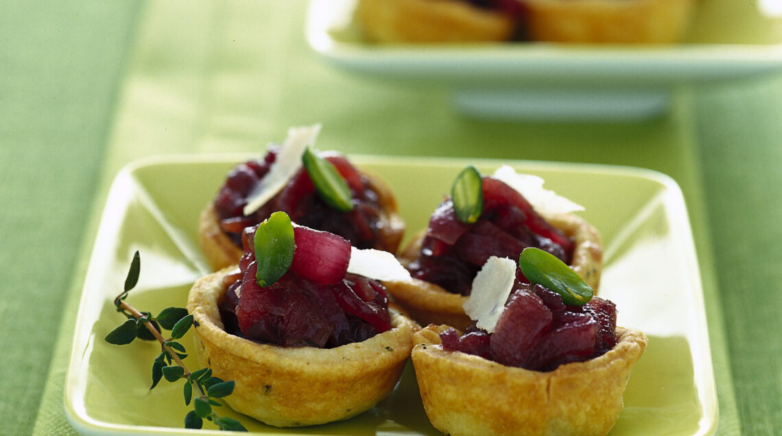 7) Completa le tartellette con cipolline all'aceto balsamico con qualche pistacchio al naturale sgusciato e pelato e alcune scagliette di pecorino.
