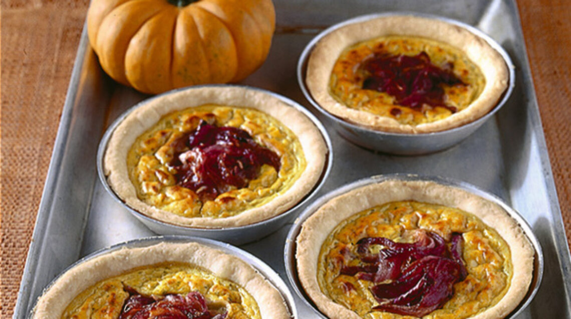 3) Rivesti con la pasta pronta per pizza 8 stampini antiaderenti (del diametro di 9 cm) ed elimina la pasta eccedente; quindi bucherella il fondo con una forchetta, suddividi la crema di zucca e disponi, al centro, un mucchietto di cipolle.