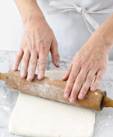 Per realizzare i vol-au-vent ai funghi inizia col sistemare 500 g di pasta sfoglia su un piano di lavoro infarinato e stendila, con il matterello sempre infarinato, in un rettangolo dello spessore di circa mezzo cm.