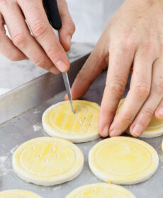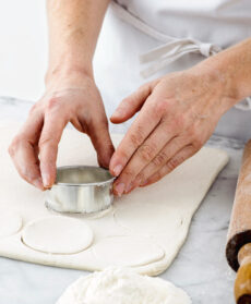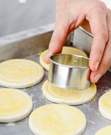 Prendi un tagliabiscotti a bordi lisci della larghezza di 7-8 cm e ricava dalla sfoglia tanti dischi, infarinando ogni volta la base del tagliabiscotti.