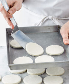 Solleva la pasta circostante e mettila da parte, quindi preleva ogni disco con una larga spatola di metallo e sistemalo su una placca inumidita con acqua fredda; copri la placca con un foglio di carta da forno e passa in frigorifero per mezz'ora.
