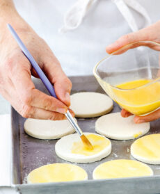 Intanto scalda il forno a 180°; trascorso il tempo di riposo estrai la placca dal frigo e spennella i dischi con un uovo sbattuto con un cucchiaio di latte.