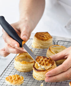 Appena i vol-au-vent sono gonfi e dorati sfornali, trasferiscili su una gratella da pasticceria e lasciali intiepidire, quindi con la punta del coltellino solleva delicatamente i coperchietti e mettili da parte.