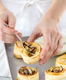 Fai saltare in padella 250 g di funghi porcini a fettine con 2-3 cucchiai di olio e uno spicchio d’aglio, lasciali intiepidire, poi, usando un cucchiaio, distribuiscili nei vol-au-vent che avrai sistemato ancora sulla placca. Completa la farcitura di ciascuno con un cucchiaio di besciamella e una spolverata di prezzemolo; prima di servire ripassali in forno per qualche minuto, poi sistemateli sui piatti con i loro coperchietti.