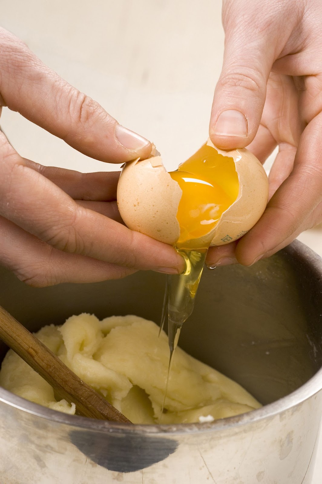 2) Cuocete, senza smettere di mescolare,finché la pasta si stacca dalle pareti del recipiente formando un unico blocco (basteranno un paio di minuti). Togliete dal fuoco, lasciate intiepidire la pasta e incorporate, uno alla volta, le uova, mescolando energicamente (meglio usare le fruste elettriche a gancio). Sollevate il composto: se è molto duro, unite, a piccole dosi, ancora un po' di uovo.