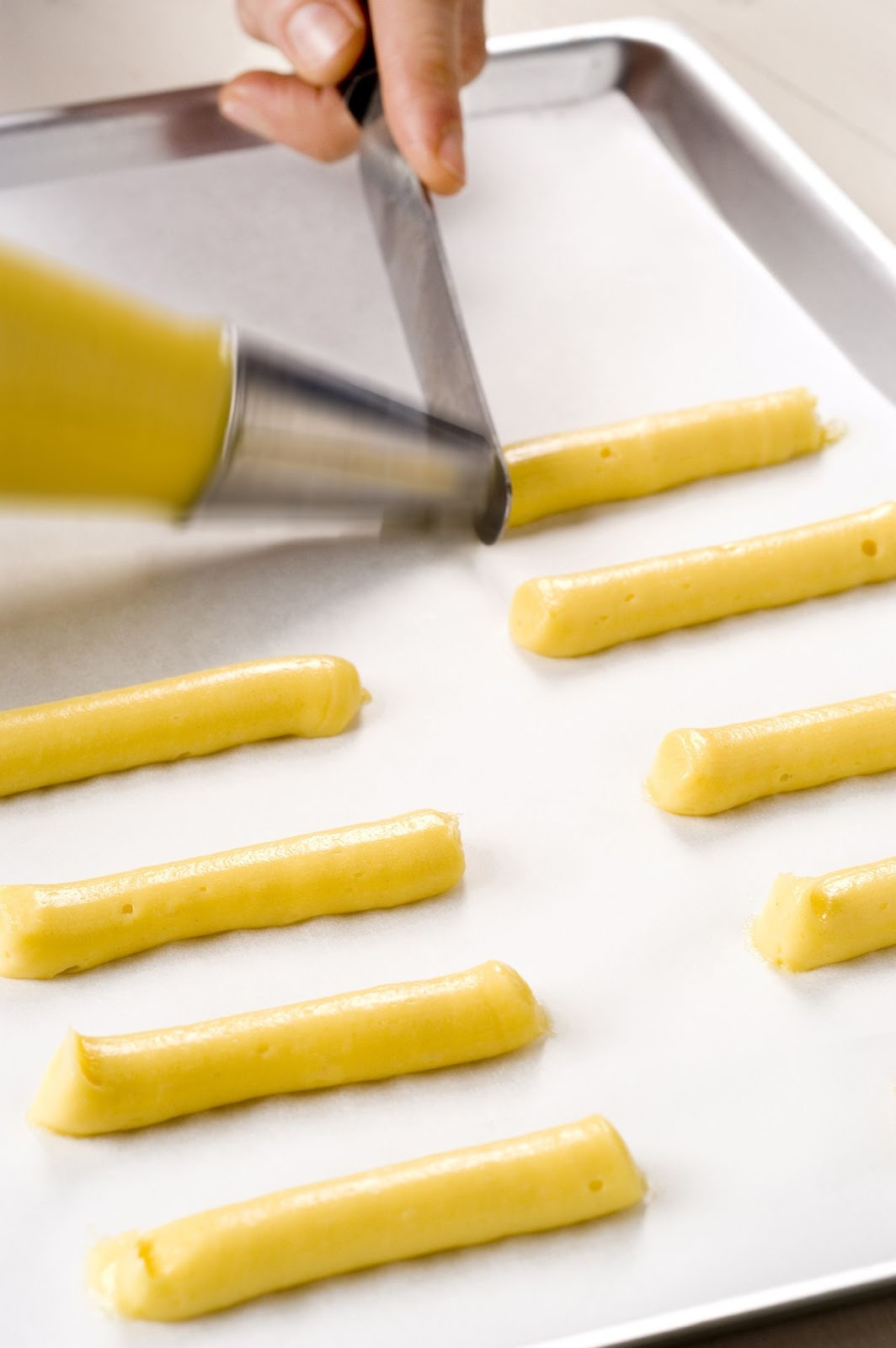 3) Mettete l'impasto di base in una tasca con bocchetta liscia; fatelo scendere a strisce di 5-6 cm su una placca foderata con carta da forno; per tagliarlo, usate una piccola spatola inumidita.