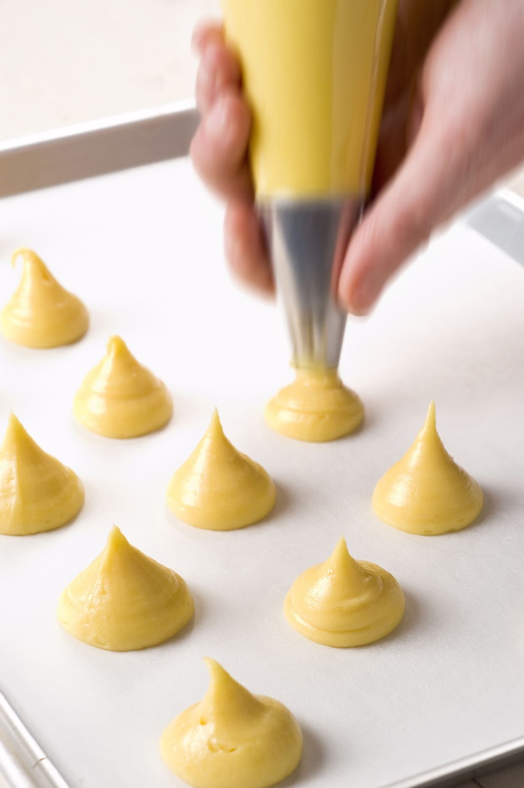 4) Mettete l'impasto di base in una tasca con bocchetta liscia; tenendo la tasca diritta, fatelo scendere su una placca foderata con carta da forno a ciuffi equidistanti larghi un paio di cm.