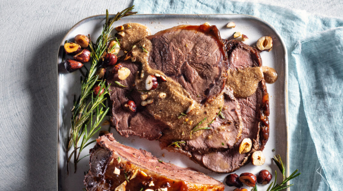 3) Sciogliete nel fondo di cottura il burro rimasto, poi aggiungete la farina e mescolate con una frusta. Diluite il fondo aggiungendo ancora un po' di brodo, poco alla volta; poi unite anche 2/3 delle nocciole tritate finemente e mescolate: dovrete ottenere una salsa abbastanza fluida (diluitela eventualmente con altro brodo). Tagliate l'arrosto a fette, completate con le nocciole rimaste, tritate grossolanamente, e nappate con la salsa preparata.