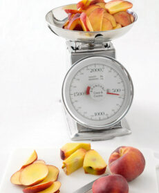 Per la ricetta della pirsicata, lava 1,3 chili di pesche nettarine a polpa gialla, elimina i noccioli, tagliale a fette e pesane 1 kg.