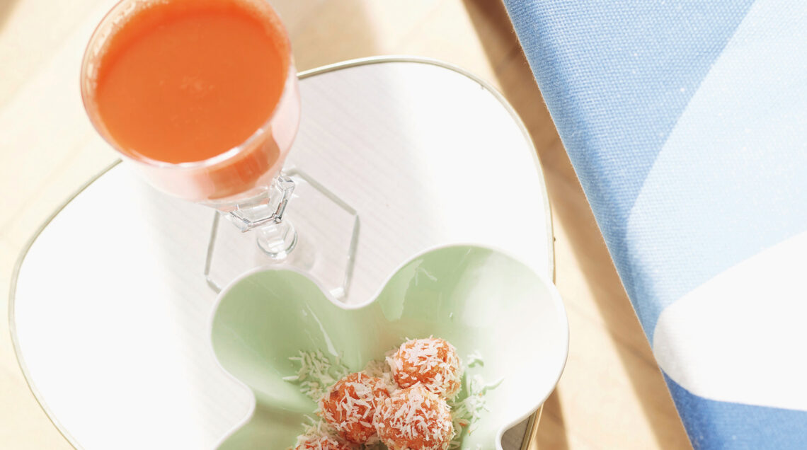 Un succo vegetale, colorato, ricco di nutrienti e sano, perfetto per iniziare la giornata, come spuntino o da servire con un ricco brunch. Ricavato con l'estrattore, il succo limpido si serve fresco, magari accompagnato com palline deliziose al cocco.