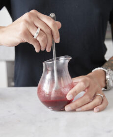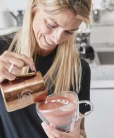 Una bevanda raffinata, di singolare bellezza e creatività. Con doppio caffè espresso, latte e barbabietola essiccata allo zenzero