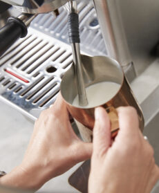 Montate il latte con la lancia della macchina espresso, oppure scaldatelo fino a 60-65° (senza farlo bollire) e montatelo con un frustino elettrico da cucina o una frusta a mano fino a ottenere una schiuma morbida.