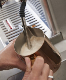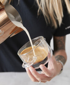 Trasferite il doppio espresso in una tazza trasparente e versate lentamente con movimenti circolari la bevanda appena montata per formare il disegno desiderato ritoccandolo con uno stecchino per creare cuori e foglie.