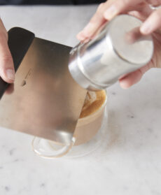 Spolverizzate un pizzico di polvere di liquirizia sulla superficie usando un tagliapasta o un altro strumento rigido per disegnare una linea che a contatto con il liquido si scioglierà leggermente.