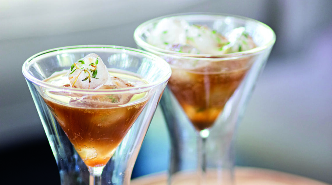 Un drink analcolico perfetto per la carica necessaria ad affrontare una calda giornata estiva: il coffee tonic, a base di caffè ristretto e acqua tonica, è insaporito da cubetti di ghiaccio profumati al timo