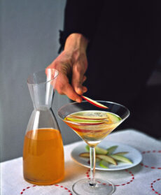 L'Apple Martini si serve in coppette da cocktail freddissime (vanno messe qualche minuto in congelatore). Volendo, si possono decorare le coppette intingendo il bordo in succo di limone e poi passandolo nello zucchero di canna o nel caffè in polvere. Si aggiunge poi una fettina di mela, rigorosamente verde.