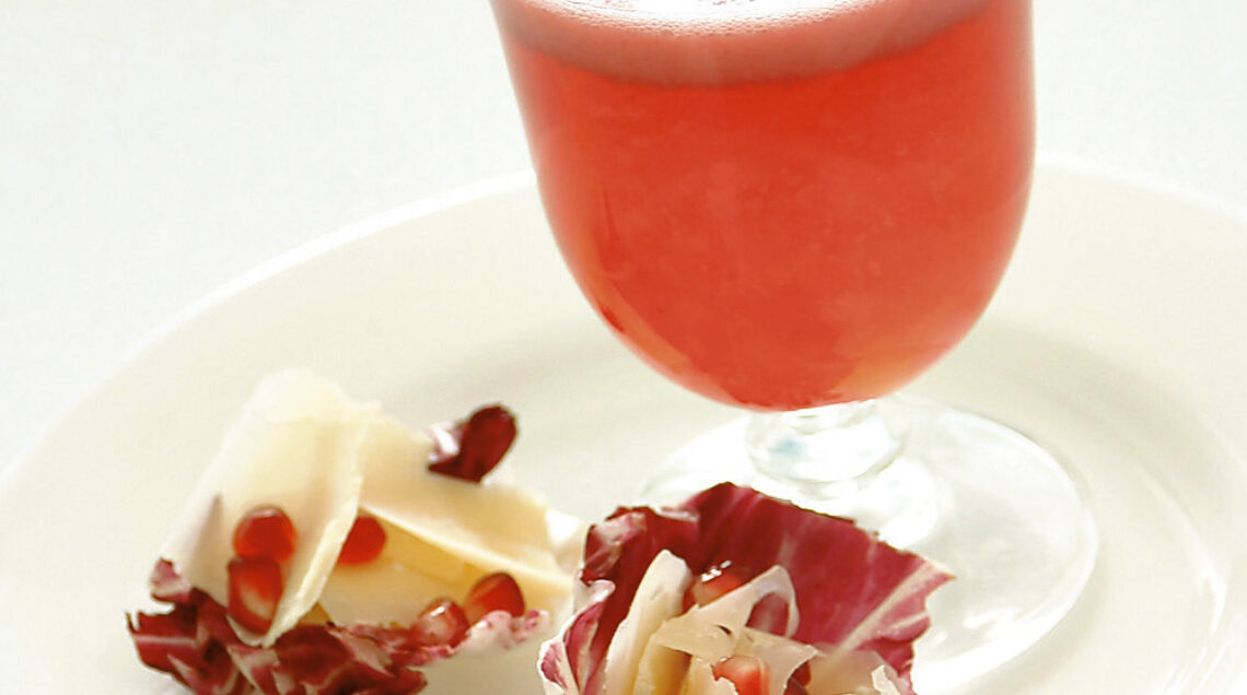 2) Dopo qualche minuto, togli il pentolino dal fuoco, lascia raffreddare il tutto e poi filtralo usando un colino. Versalo nei calici e colma ogni bicchiere aggiungendo dello spumante appena tolto dal frigorifero. Servi i calici con il cocktail allo spumanteaccompagnati da del grana tagliato a fettine molto sottili e a dei chicchi di melagrana adagiati su foglie di radicchio rosso.
