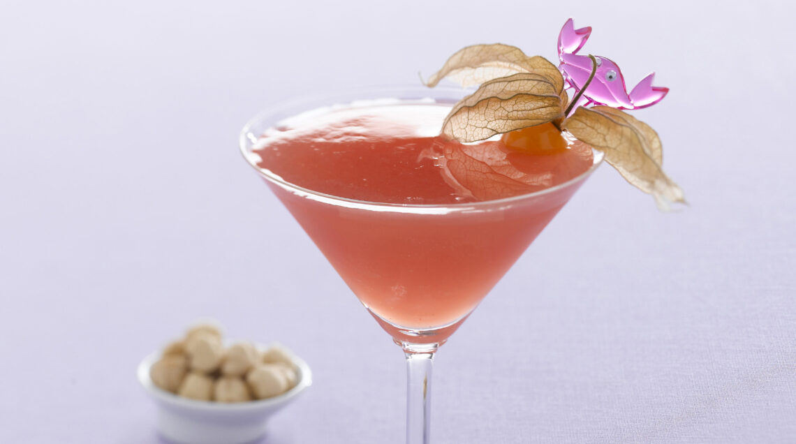 2 Filtrate in una coppa da Martini ghiacciata. Decorate con un alchechengi e un bastoncino colorato e, se vi piace, con una fetta di carambola e una spirale di arancia e lime.