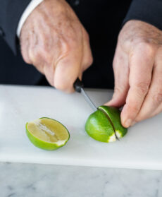 Ricavate 2 semi dalla bacca di anice stellato. Mettete il lime, il finocchietto (eccetto un pezzetto per decorare) e i semi di anice stellato all'interno di un Boston shaker e pestate con un pestello.