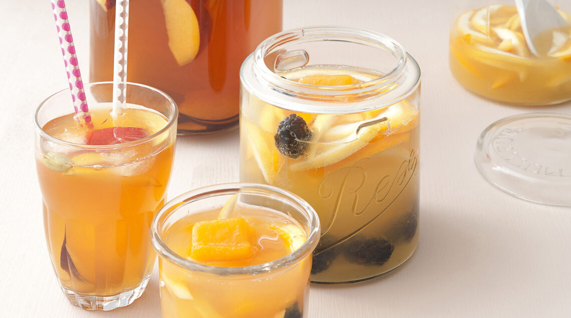 3) Prima di servire, versa in una bowl le bucce con il loro liquido, versaci sopra 2 bottiglie da 75 cl di vino bianco ghiacciato, aggiungi una vaschetta di more, i cubetti di mango e servi subito la sangria esotica.