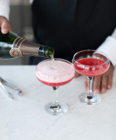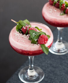 Prepara 6 bicchieri da spumante, aggiungi in ogni bicchiere un po’ di spuma e poi versa lo spumante. Sul bordo del bicchiere termina con un po’ di spuma e poni un piccolo spiedino con foglie di menta e lamponi sul bordo.