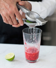 Mescola il tutto con un pestello da cocktail. Aggiungi del succo di lime, la vodka e lo sciroppo di zucchero. Prendi una coppetta da cocktail e mescola.