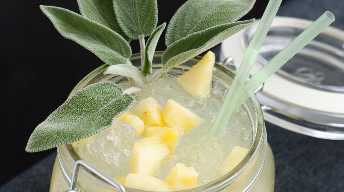 Completate con la tequila, mescolate e guarnite con la fetta di ananas tagliata a cubetti e il rametto di salvia; servite con cannucce.