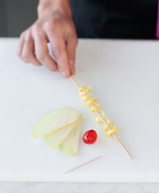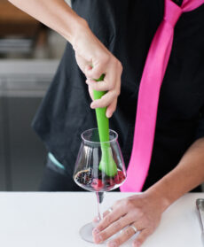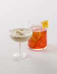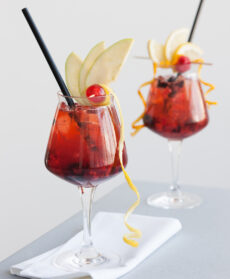Arrotola la spirale di scorza attorno a un lungo stecco e taglia lo spicchio di mela con la buccia a fettine sottili. Guarnisci il cocktail con la ciliegina candita infilzata su uno stecchino e le fettine di mela disposte a ventaglio.