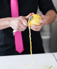 Lava bene il limone, asciugalo e incidi tutt'intorno la scorza con un rigalimoni in modo da ottenere un'unica lunga spirale.