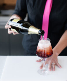 Per preparare lo spritz al lampone in un bicchiere a calice raccogli lo zucchero di canna, aggiungi le more e i lamponi lavati e asciugati, quindi il concentrato di frutti di bosco. Schiacciate con il muddler (l'apposito pestello) la frutta in modo da amalgamarla con lo zucchero e il concentrato.