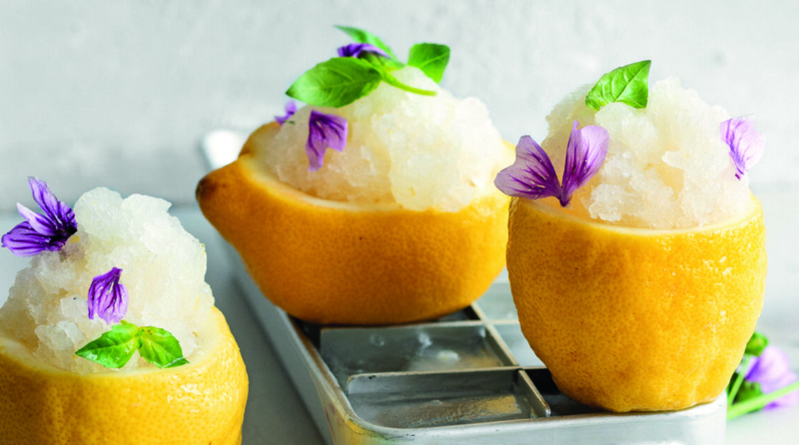5 Se volete, potete servire la granita in 4 grossi limoni dopo averne asportato la polpa con un cucchiaino (o in 4 bicchieri), guarnite con foglie di basilico e, se vi piace, fiorellini di malva.