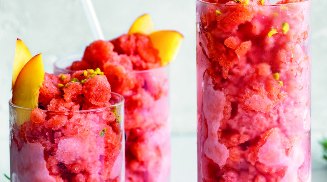 4 Servite la granita nei bicchieri decorandola con la pesca rimasta tagliata a fettine e un po' di granella di pistacchi.