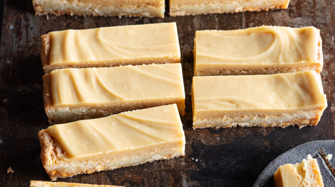 4 Distribuite la ganache al cioccolato bianco sulla superficie del dolce, lasciate rassodare la copertura e poi tagliatelo in 12 rettangoli; servite.