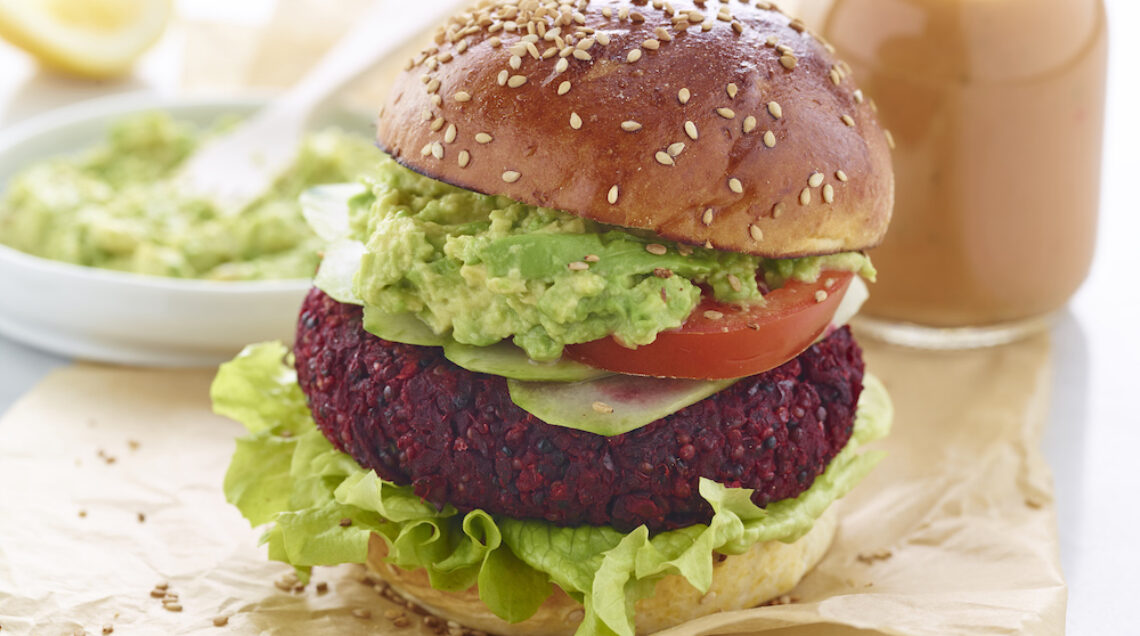 1) Iniziate la preparazione dei burger rossi con l'avena. Sbucciate e grattugiate la barbabietola. Tritate la cipolla, soffriggetela con 2 cucchiai di olio, unite la barbabietola strizzata, salate e cuocete per 10 minuti. Bagnate con 1 cucchiaio di aceto e fate evaporare. Mescolate il mix in una ciotola con la quinoa, i fiocchi di avena, i semi di lino, 2 cucchiai di prezzemolo tritato, pepe e il succo di limone e formate 4 burger.