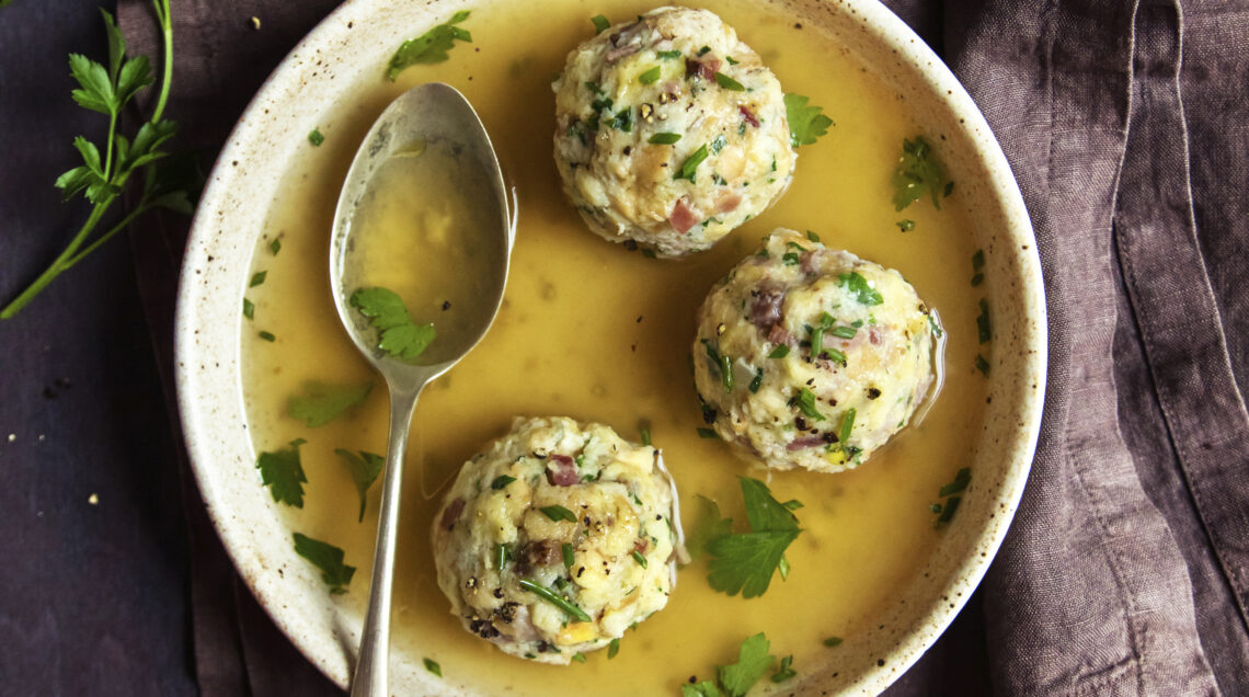 Con le mani inumidite d'acqua, prelevate poco impasto alla volta e ricavate 8 pallotte, lavorandole tra le mani. Tuffatele in acqua bollente salata, fate riprendere l'ebollizione, coprite leggermente il recipiente e abbassate la fiamma. Lessate i canederli per 15-20 minuti, scolateli con un mestolo forato e distribuiteli nei piatti con qualche mestolo di brodo di carne ben caldo.