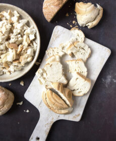 Tagliate il pane prima a fette, poi a cubetti e raccoglieteli in una ciotola.