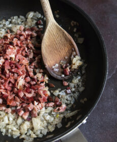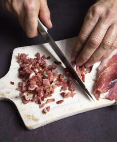 Sbucciate la cipolla, tritatela, fatela appassire in una padella con una noce di burro e rosolatevi brevemente lo speck. Versate il mix sui dadini di pane.