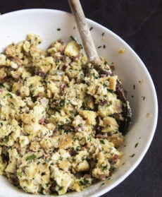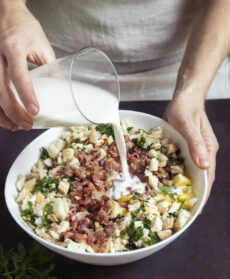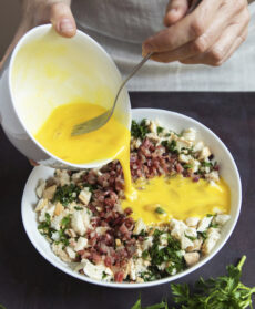 Sgusciate le uova in un'altra ciotola, sbattetele leggermente e unitele agli altri ingredienti, insieme con il prezzemolo pulito e tritato (o l'erba cipollina tagliuzzata finemente) e una presa di sale. Mescolate.