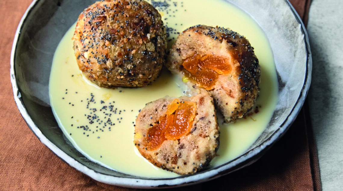 6) Distribuite la crema nei piatti, disponetevi i canederli e cospargete con i semi di papavero rimasti.